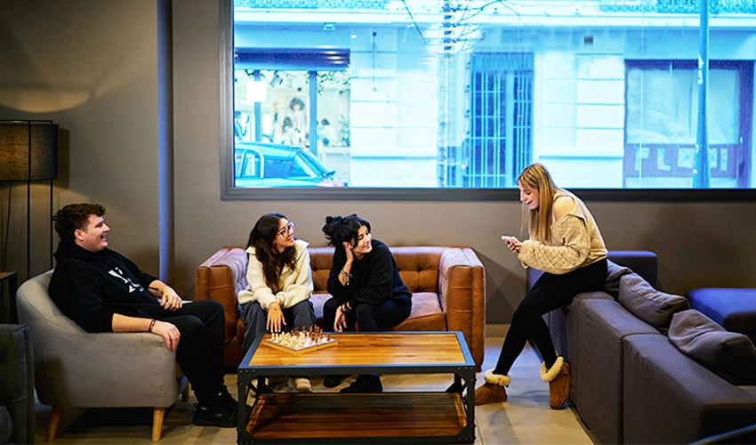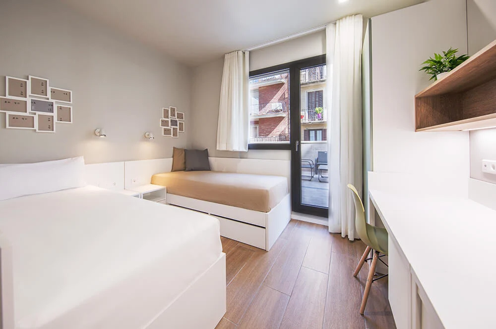 Os alunos ficam hospedados em um edifício moderno no centro da cidade, ao lado de Passeig de Gràcia e Diagonal. A acomodação é composta por quartos espaçosos e modernos com banheiro privativo e todas as comodidades para o estudante. O edifício ainda conta com ginásio ao ar livre, solário, sala de jogos e sala de cinema.