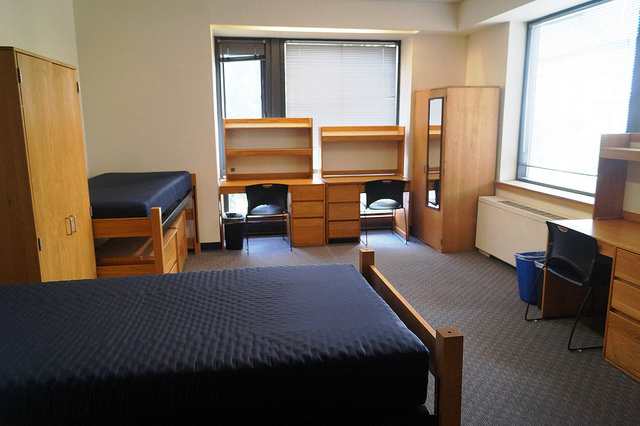Acomodação em residências estudantis oficiais de Barnard College, com quartos duplos e banheiros compartilhados.